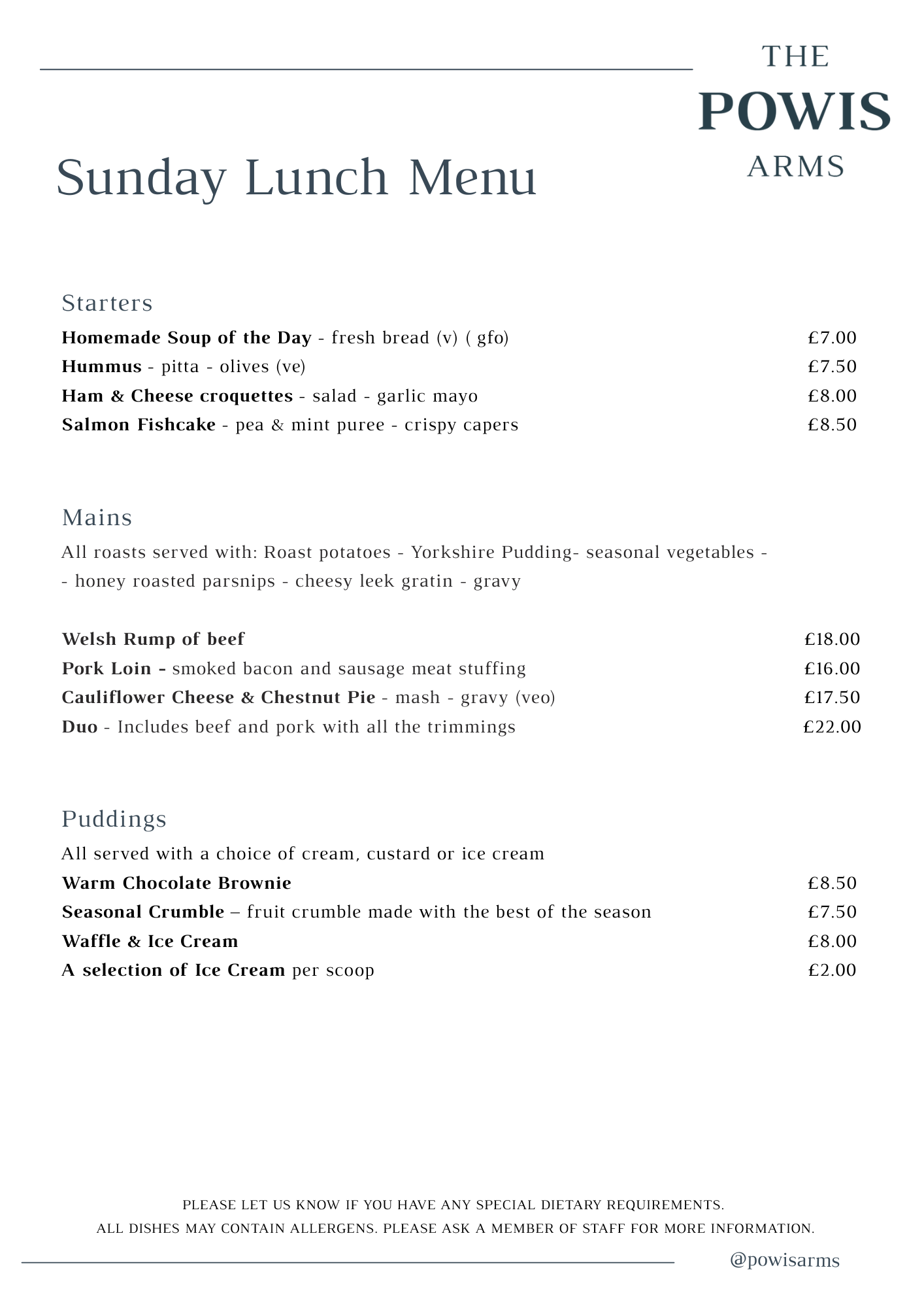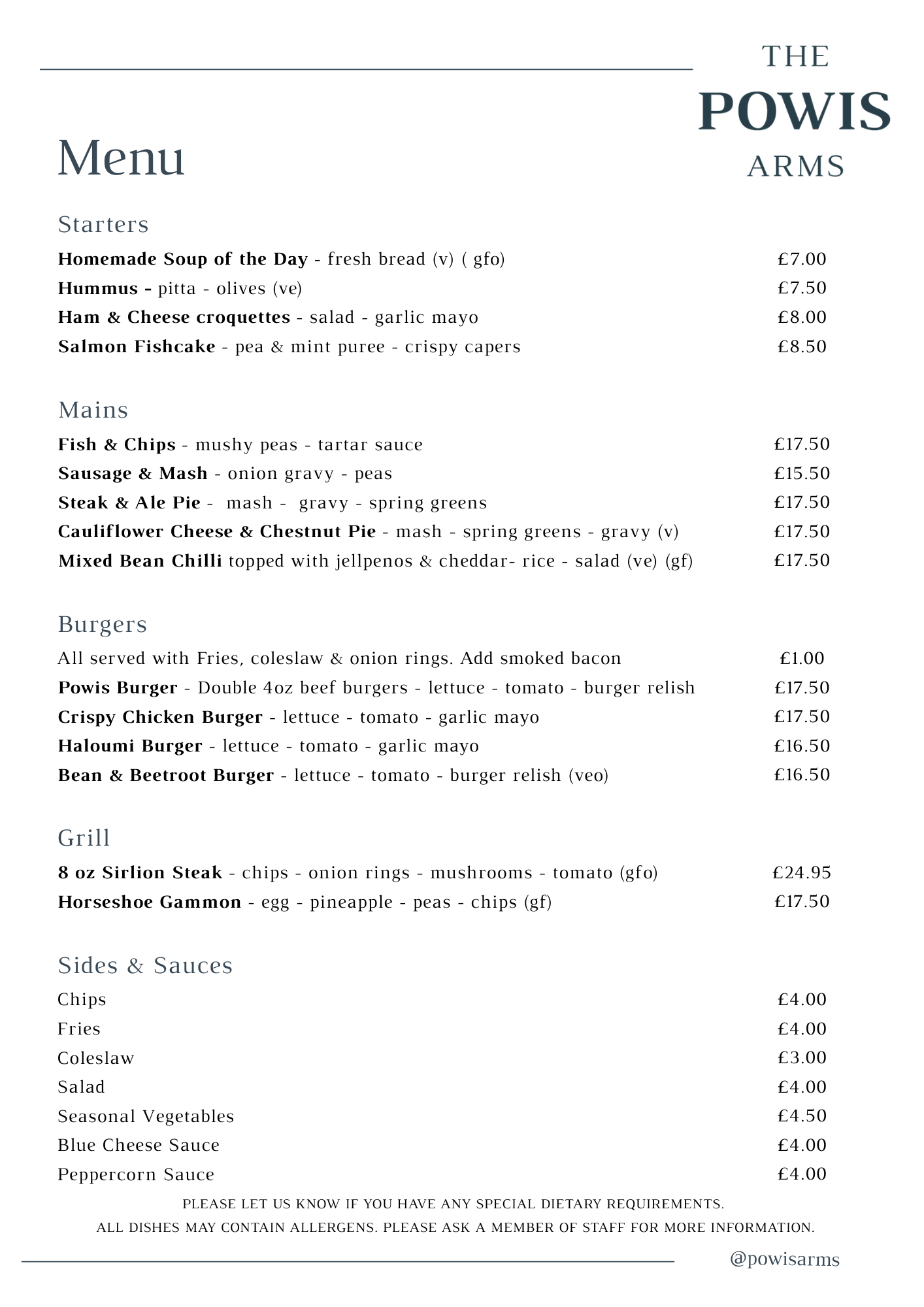 Our menu consists of core pub classics with the addition of interesting but simple dishes celebrating great local ingredients. Everything is freshly prepared daily by our team and we try to cater for specific dietary requirements.